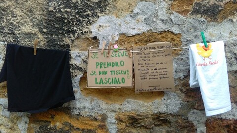 Following a European trend, someone in the heart of Palermo has started a "Wall of Kindness". One clothesline where people can leave what they want to donate, or take what they need, not far from the city's principal mosque. Here is a one-minute video report from La Repubblica.