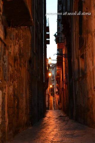 Vicolo Castelnuovo is off the Via Vittorio Emanuele in the Albergheria quarter. Only a few streets in Palermo are still paved with these elegant hexagonal paving stones. The street is surprisingly free of garbage. South Asians live here.