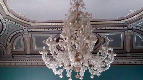A chandelier hanging from what used to be a frescoed ceiling in a Via Maqueda palace.