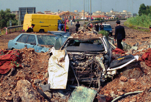 A photo of the explosion site on the highway in Capaci, between the airport and Palermo town. Date: 23 May 1992
