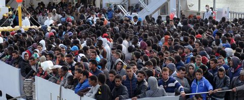 Disembarkation operations yesterday for hundreds of newly rescued boat people were only half done by 6 p.m.. The remaining hundreds were left on the ship's deck in the cold rain to await processing: a sandwich to eat, clothes to wear, miedical triage, identification, and then to the police station for a mugshot. They are illegal immigrants until determined to be refugees. During the long wait one woman had a panic attack and went into a fit. One guy jumped from the ship deck to the dock. People were shaking with the cold, covered their heads with their gold-coated thermal blankets. They were still being offloaded late at night, according to the report.