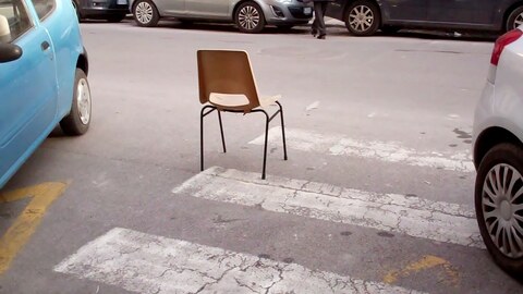 A chair in the street means "Don't park here, this is MY spot." Never mind that the spot is in the middle of a striped pedestrian crossing, where it is illegal to park anyway.