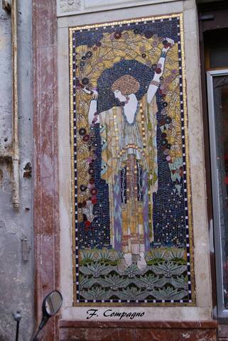 Here is the mosaic of Il Capo, one of Palermo's three suqs. It is an art deco (in Sicily they would say Stile Liberty) mosaic depicting Demeter, the goddess of grains and agriculture, the mother of Persephone, and it is embedded in the exterior wall of the now closed Panificio Morello. A few tiles are missing. It ought to be protected and preserved.